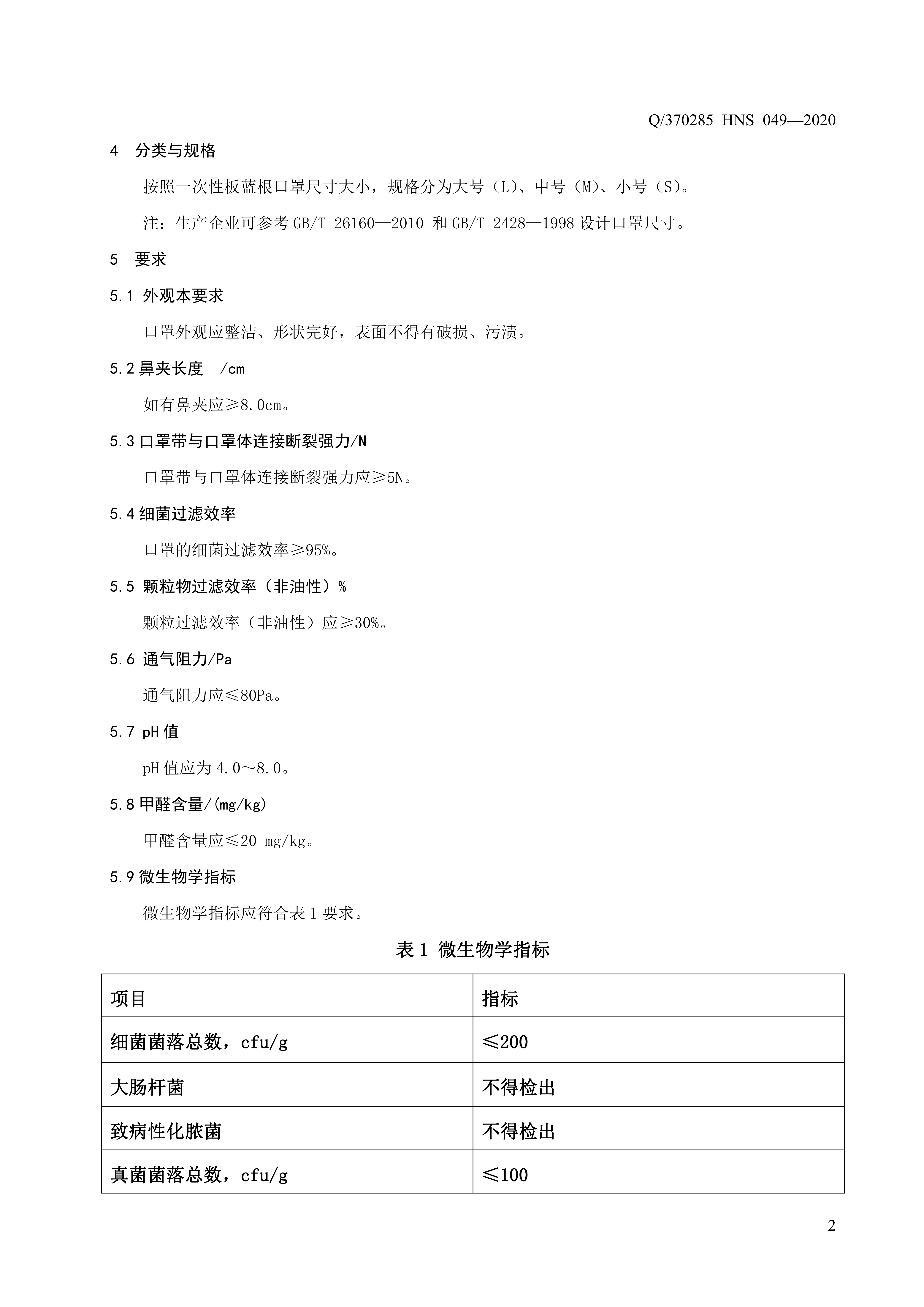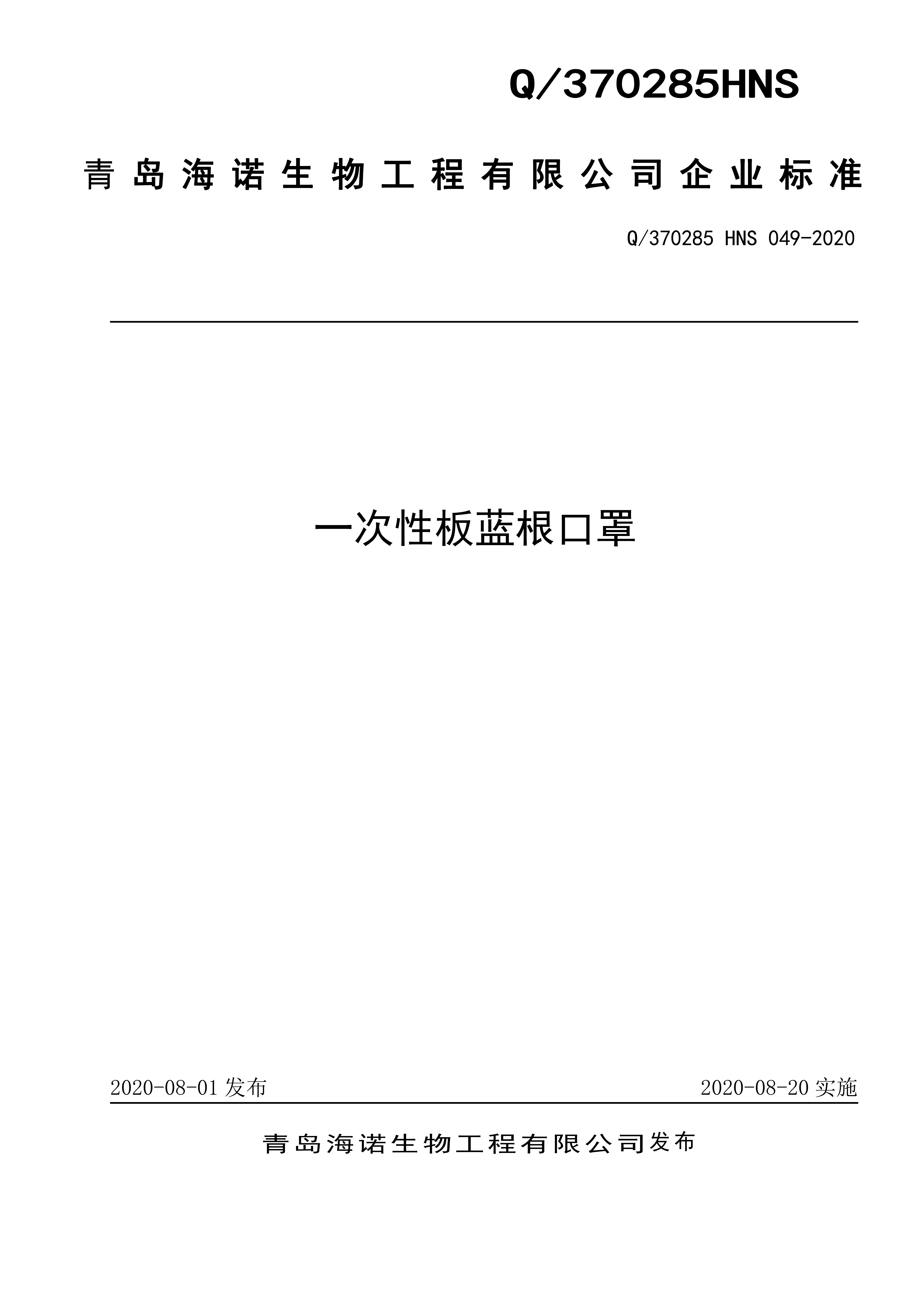 青島海諾生物工程有限公司企業標準 — 一次性板藍根口罩