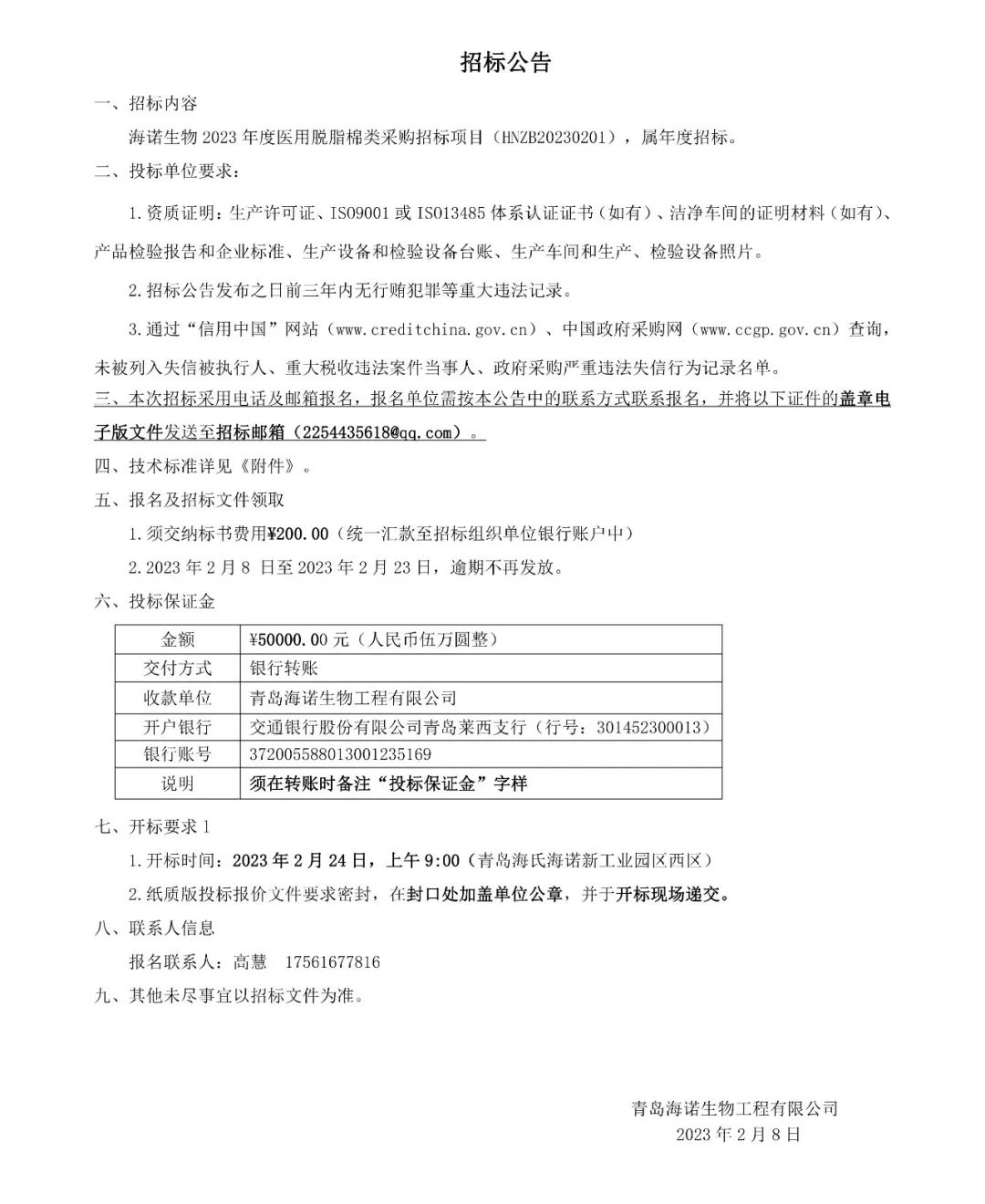 海諾生物 2023 年度醫(yī)用脫脂棉類采購招標(biāo)項目正式開啟
