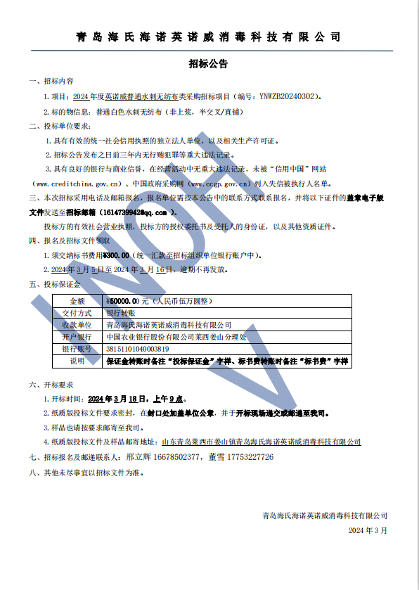 (2024)年度英諾威公司(無紡布)類采購招標公告