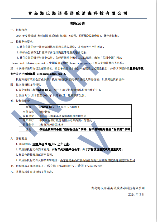 (2024)年度英諾威公司(塑料制品)類采購招標公告